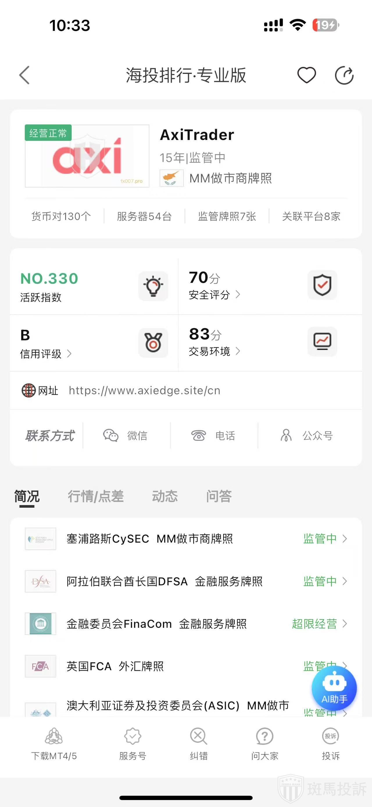根据海投排行查询显示,这家平台叫AxiTrader,成立于2010年,全球排名331名,安全评分70分,目前平台宣传自己有5个外汇监管牌照,风险扫描133条.