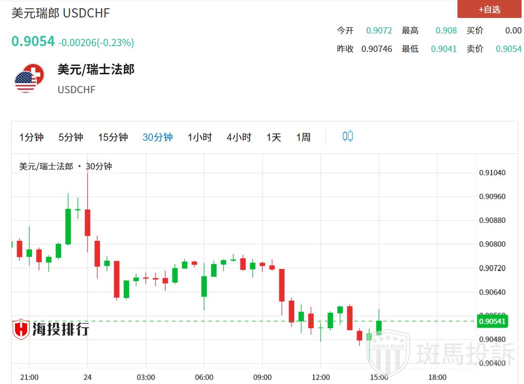 周五欧洲早盘时段,美元/瑞郎在0.9045附近持续承压,日内下跌0.23%。