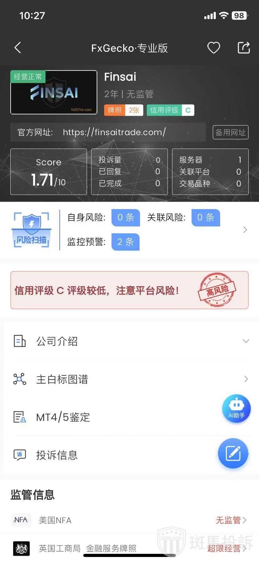 Finsai,FxGecko评分1.71分,信用评级较低,建议投资者远离!