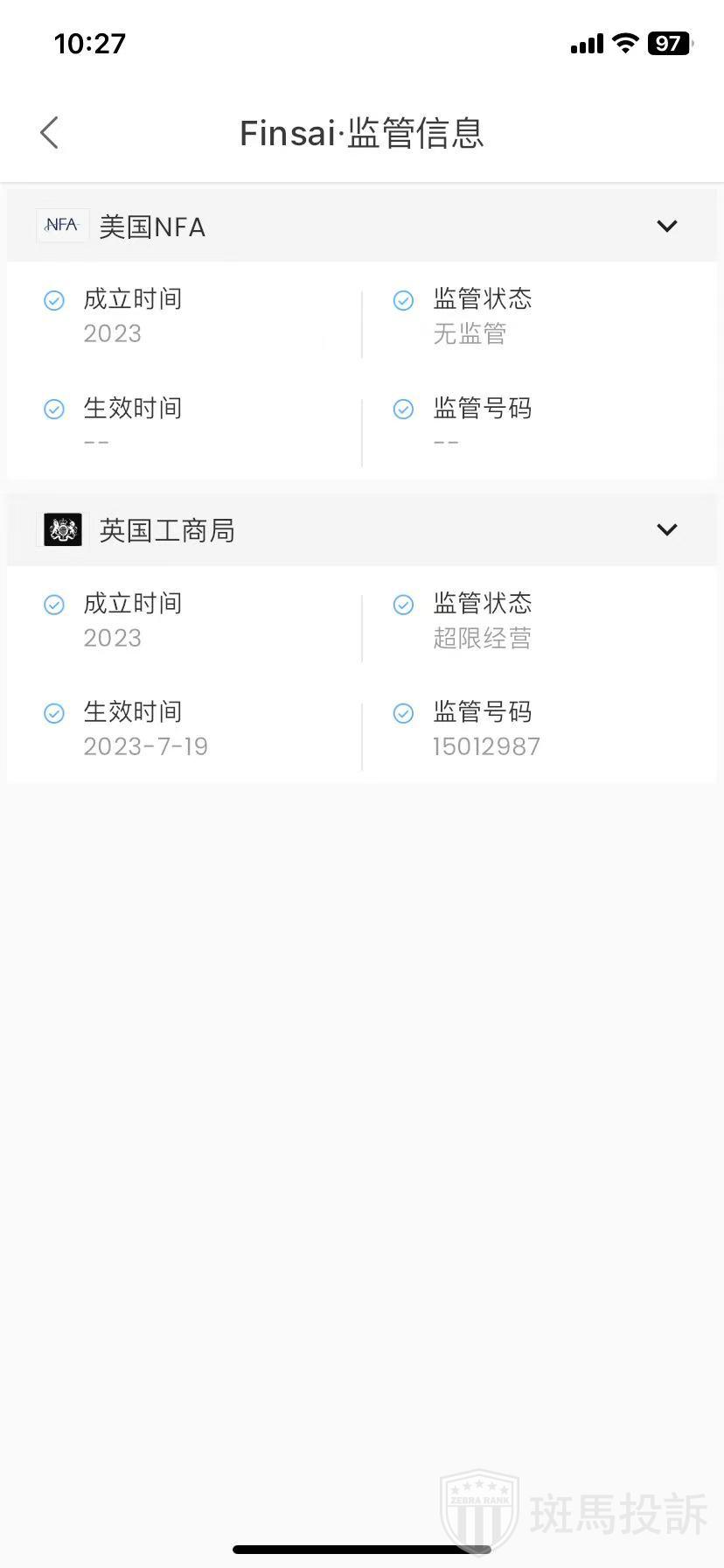 Finsai,在FxGecko显示2家监管信息。持有的美国NFA监管状态为无监管;英国工商局监管状态为超限经营。投资者资金安全无保障!