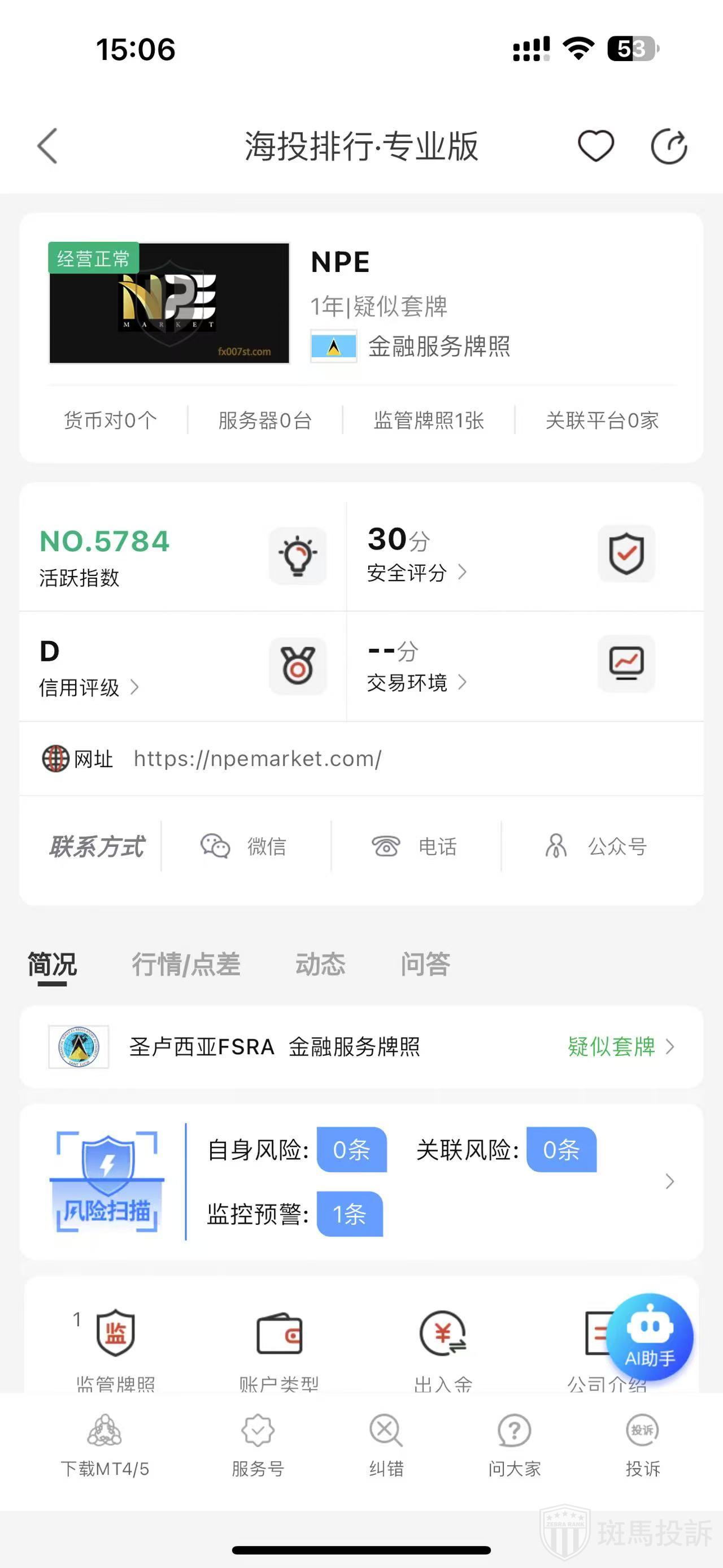 这家平台叫NPE,成立于2024年,全球活跃指数5784名,目前有1个监管,但是没有外汇牌照,疑似套牌不能做外汇保证金交易,风险扫描显示1条风险,投资者资金安全无保障。