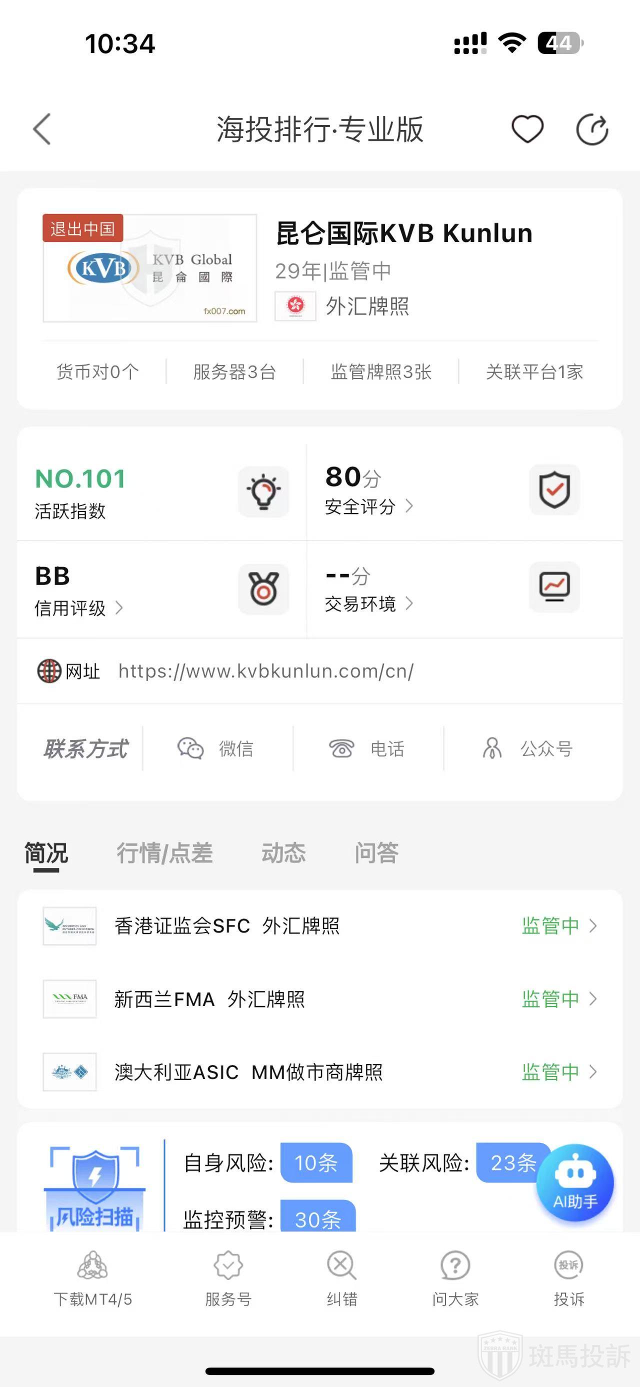 根据海投排行查询显示,这家平台叫昆仑国际KVB Kunlun,成立于1996年,全球排名100名,安全评分80分,平台宣传称目前有3个国家的监管,风险扫描预警有63条.