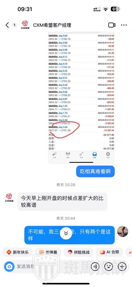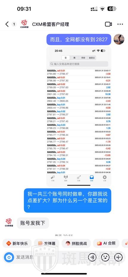 根据用户描述,其在CXM平台上使用三个美分账户运行相同的EA量化策略进行黄金交易。通常情况下,用户不会实时监控交易过程,但由于偶然的机会,用户决定亲自观察交易情况,结果发现了价格异常的现象。具体表现为:三个账户中,其中一个账户的价格显示正常,而另外两个账户在同一时间点的价格却被“修改”。这种“修改”并非针对所有订单,而是集中在某些特定订单上,尤其是当交易量达到一手之后,挂单价格会被明显抬高。