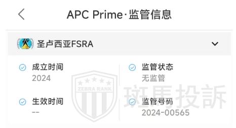 APC PRIME LTD在圣卢西亚注册,注册号为2024-00565,但是根据我们的查询,圣卢西亚FSRA并未监管APC PRIME LTD,并且圣卢西亚FSRA本身也无监管外汇交易的职能,这让投资会具有非常高的风险,望警惕!