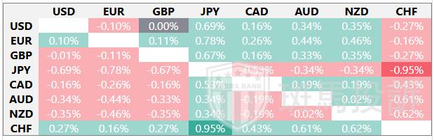下表显示了澳元(AUD)对所列主要货币今日的变动百分比。[货币名称]对[货币名称]最强。