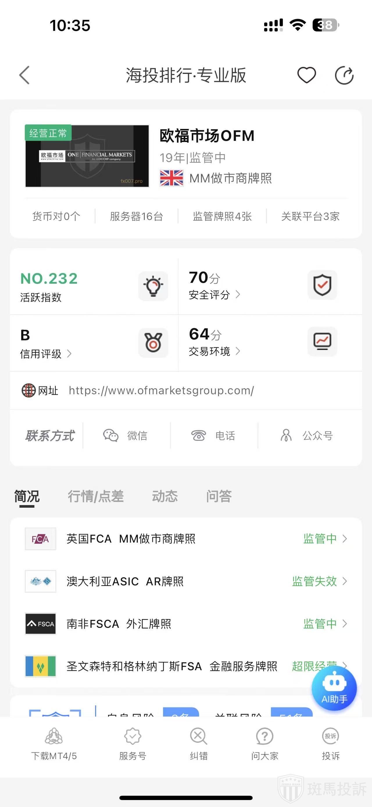 根据海投排行查询显示,这家平台叫欧福市场OFM,成立于2006年,全球排名234名,安全评分70分,平台宣传称拥有4个国家的监管牌照,风险扫描预警有68条.