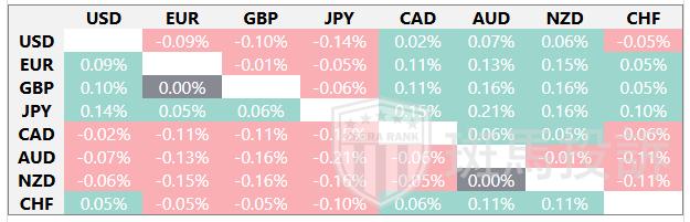 下表显示了澳元(AUD)对所列主要货币今日的变动百分比。澳元对日元最弱。
