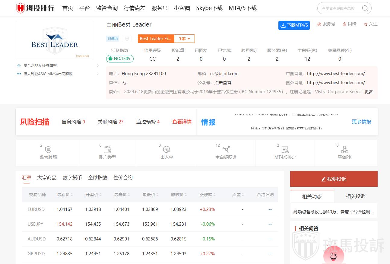 百丽Best Leader外汇平台(Best Leader Markets)是一家提供外汇、贵金属、差价合约等交易服务的在线经纪商。百丽Best Leader外汇平台由Best Leader Markets Limited运营,其母公司Best Leader Group Limited在新西兰注册,并获得了新西兰金融服务提供商注册(FSPR)牌照(注册牌照号:FSP4445469)。然而,该平台并未受到传统金融监管机构(如ASIC、FCA等)的严格监管。