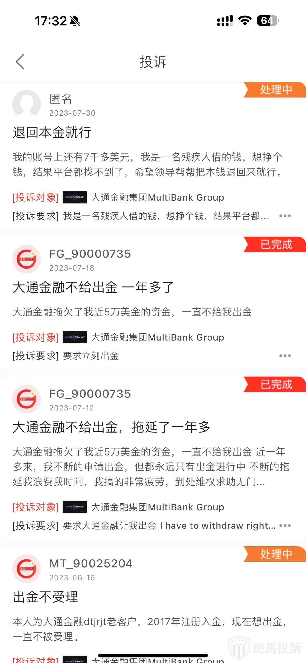 今天要想大家爆料一家平台,因为大通金融集团出金不受理问题被用户投诉,大家要注意这家平台最近的服务质量和交易环境。