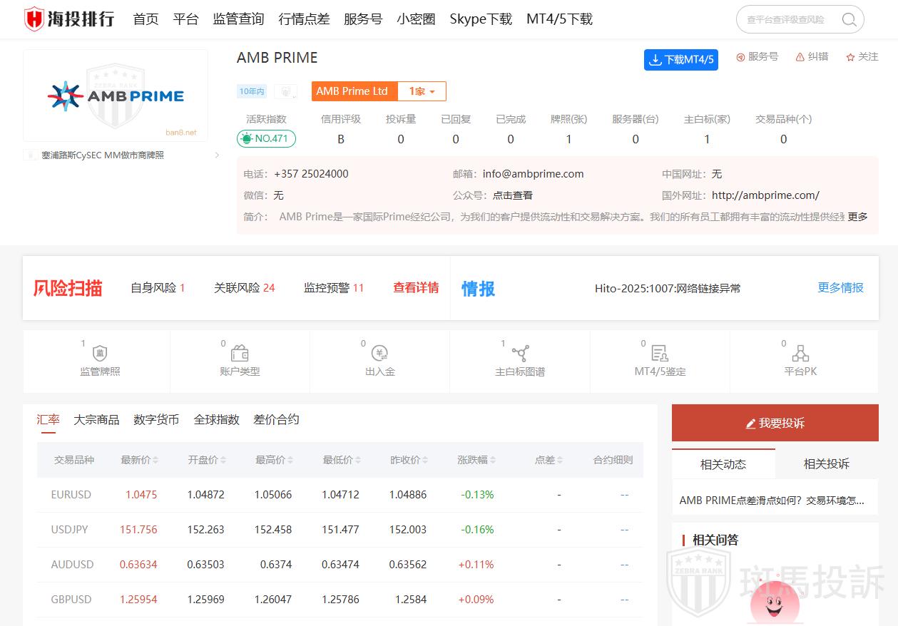 AMB Prime外汇平台是一家总部位于塞浦路斯利马索尔的国际性主券经纪公司,专注于为客户提供流动性和交易解决方案。以下是关于AMB Prime外汇平台的详细信息: