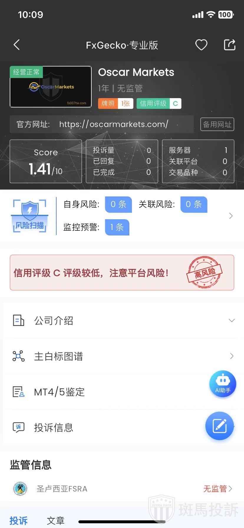 Oscar Markets ,FxGecko评分1.41分,信用评级较低,建议投资者远离!