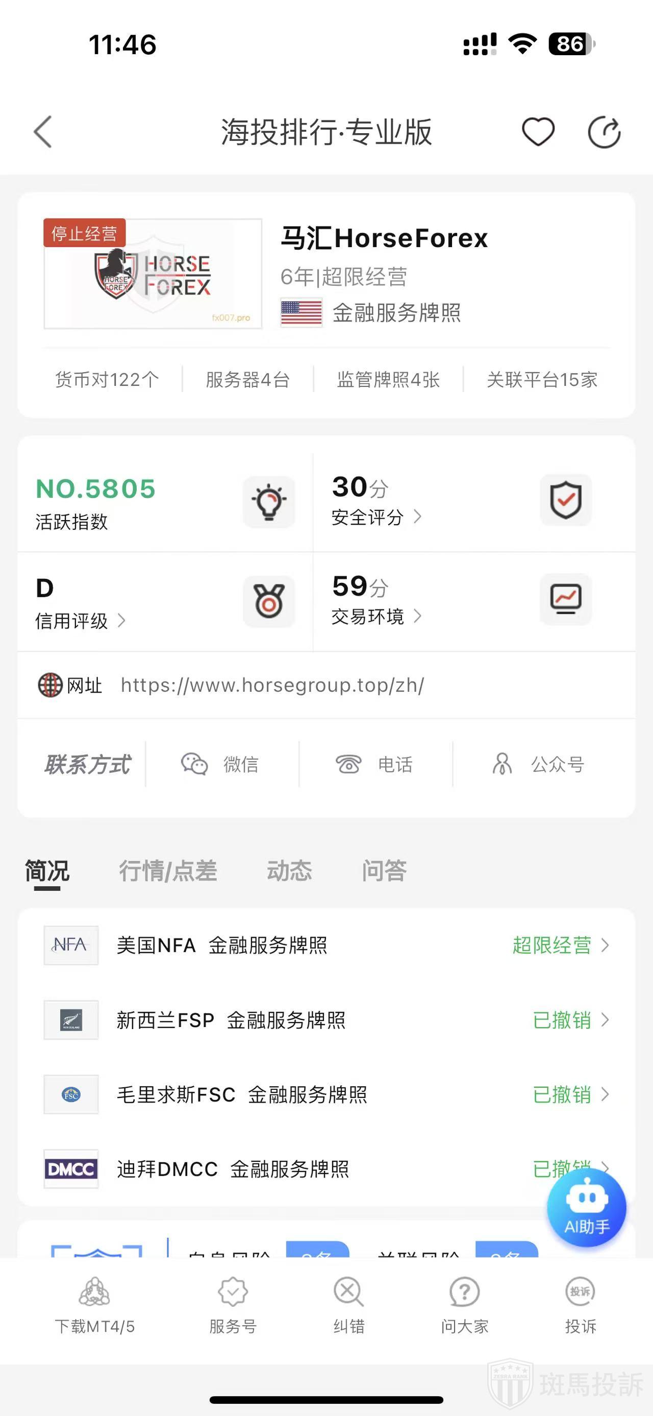 根据海投排行查询显示,这家平台叫HorseForex马汇,成立于2019年,全球排名5716名,安全评分30分,平台宣传称拥有4个国家的监管牌照,目前显示均已被撤销,风险扫描预警有40条.