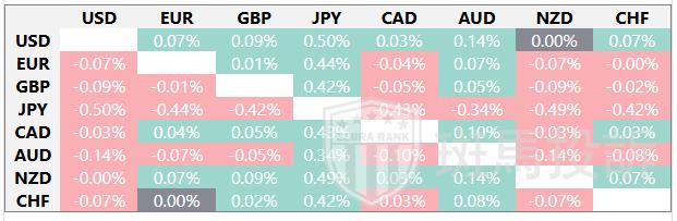 下表显示了欧元(EUR)对所列主要货币今日的变动百分比。欧元对美元最弱。