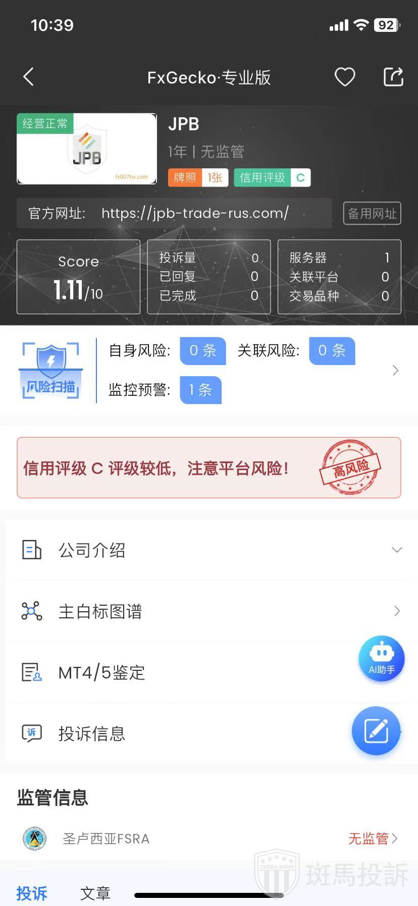 JPB,FxGecko评分1.11分,信用评级较低,建议投资者远离!