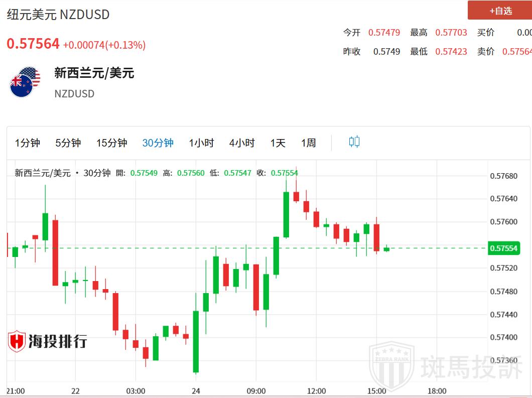 纽元/美元在周一早盘欧洲时段小幅上涨至接近0.5760,日内上涨0.31%。