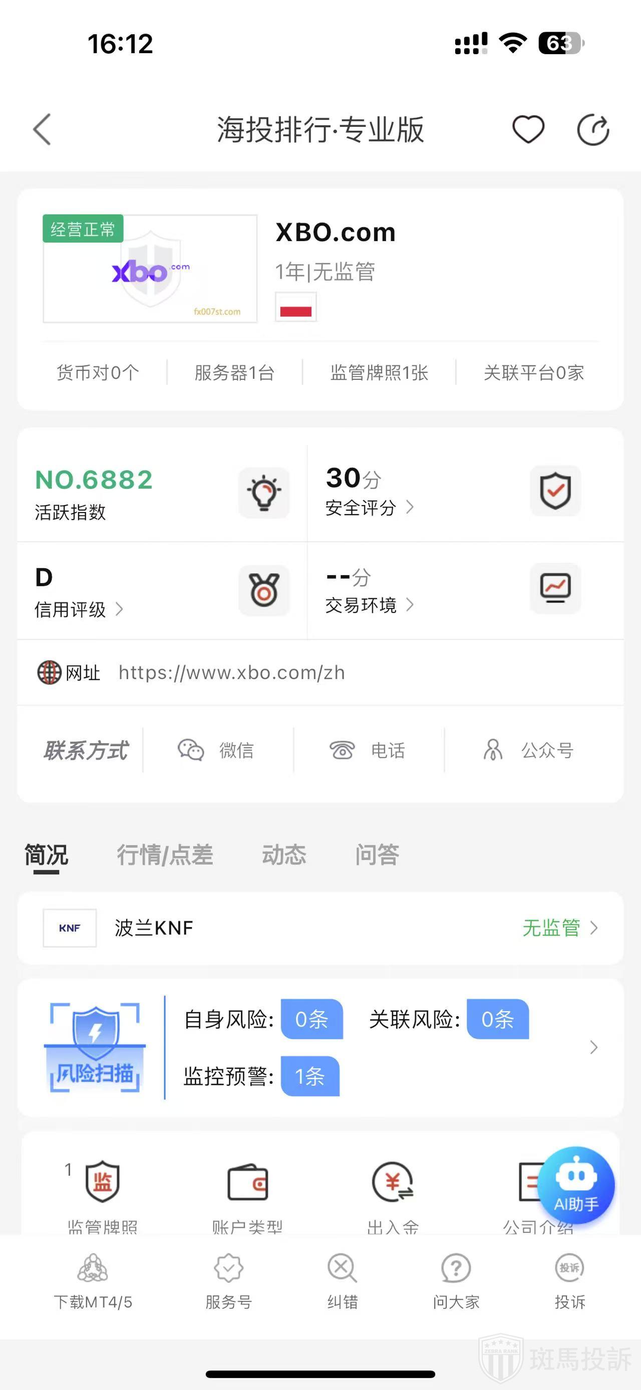 这家平台叫XBO.com,成立于2024年,全球活跃指数6882名,目前没有监管,没有外汇牌照,不能做外汇保证金交易,风险扫描显示1条风险,投资者资金安全无保障。