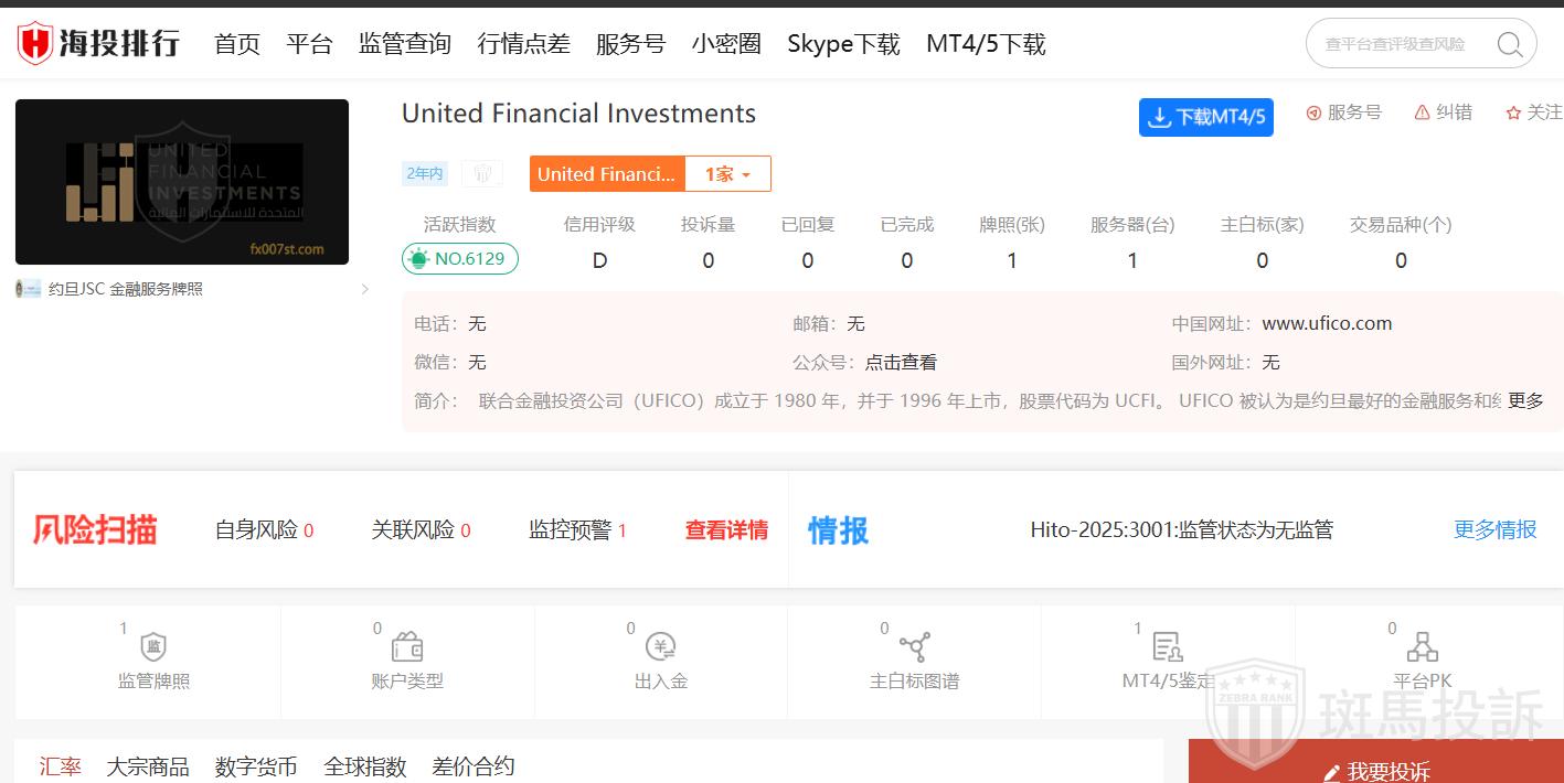 这家平台叫United Financial Investments,成立于2023年,全球活跃指数6129名,目前没有监管,没有外汇牌照,不能做外汇保证金交易,风险扫描显示1条风险,投资者资金安全无保障。