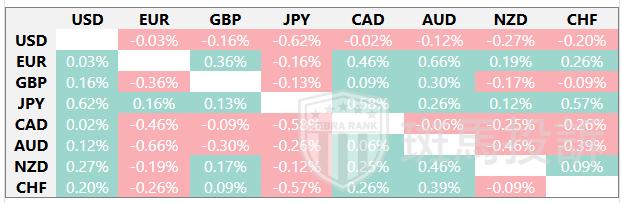 下表显示了澳元(AUD)对所列主要货币今日的变动百分比。[货币名称]对[货币名称]最强。