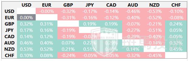 热图显示了主要货币相对于其他货币的百分比变化。基础货币从左列中选取,而报价货币从顶部行中选取。例如,如果您从左列选择加拿大元并沿着水平线移动到美元,则框中显示的百分比变化将表示CAD(基数)/USD(报价)。