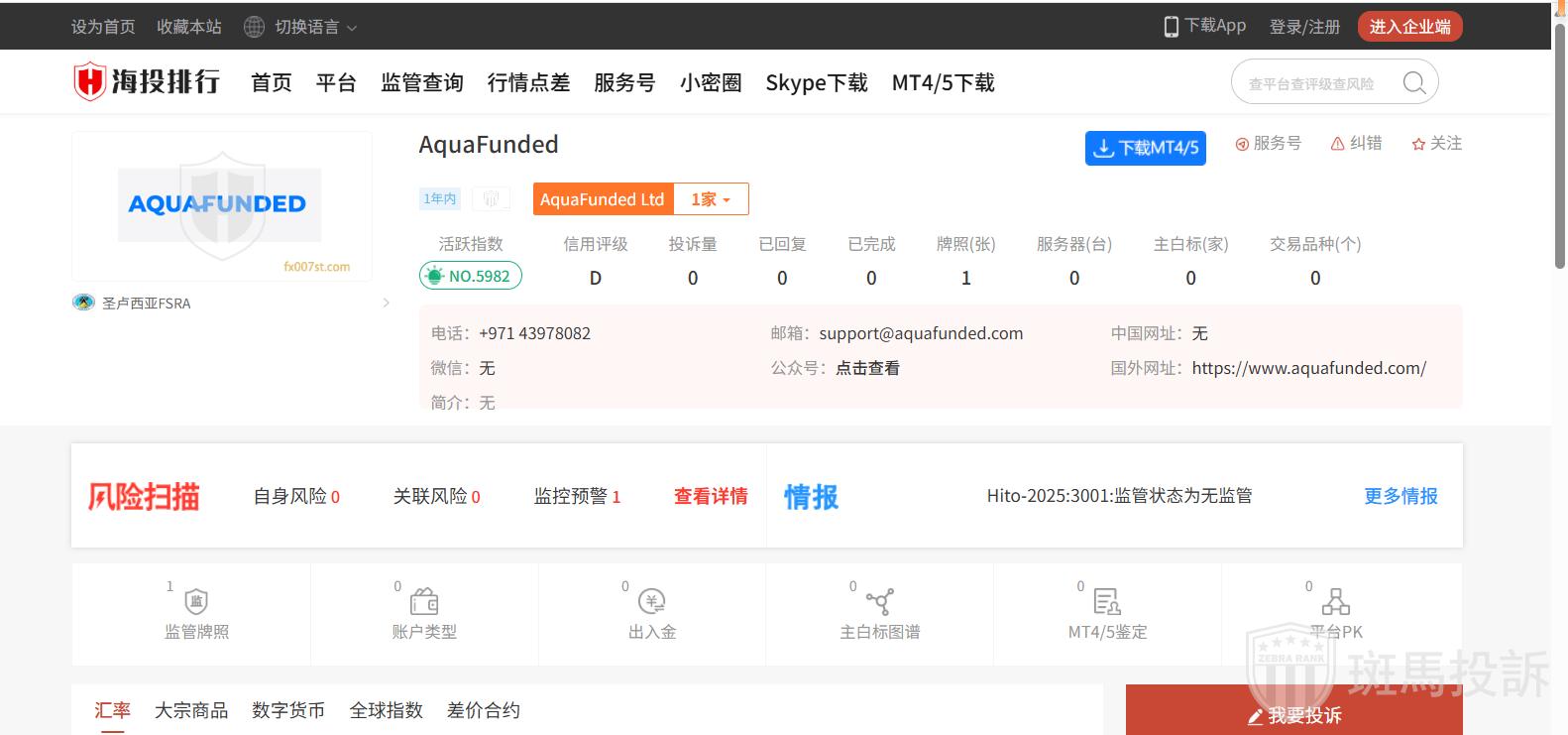 这家平台叫AquaFunded,成立于2024年,全球活跃指数5982名,目前没有监管,没有外汇牌照,不能做外汇保证金交易,风险扫描显示1条风险,投资者资金安全无保障。
