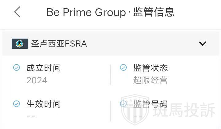 Be Prime Group平台宣称受圣卢西亚授权监管,并提供注册号 2024-00649,但经过我们的查询并没有发现相关监管信息,并且圣卢西亚FSRA本就不能监管外汇,具有一定的风险,望投资者谨慎。