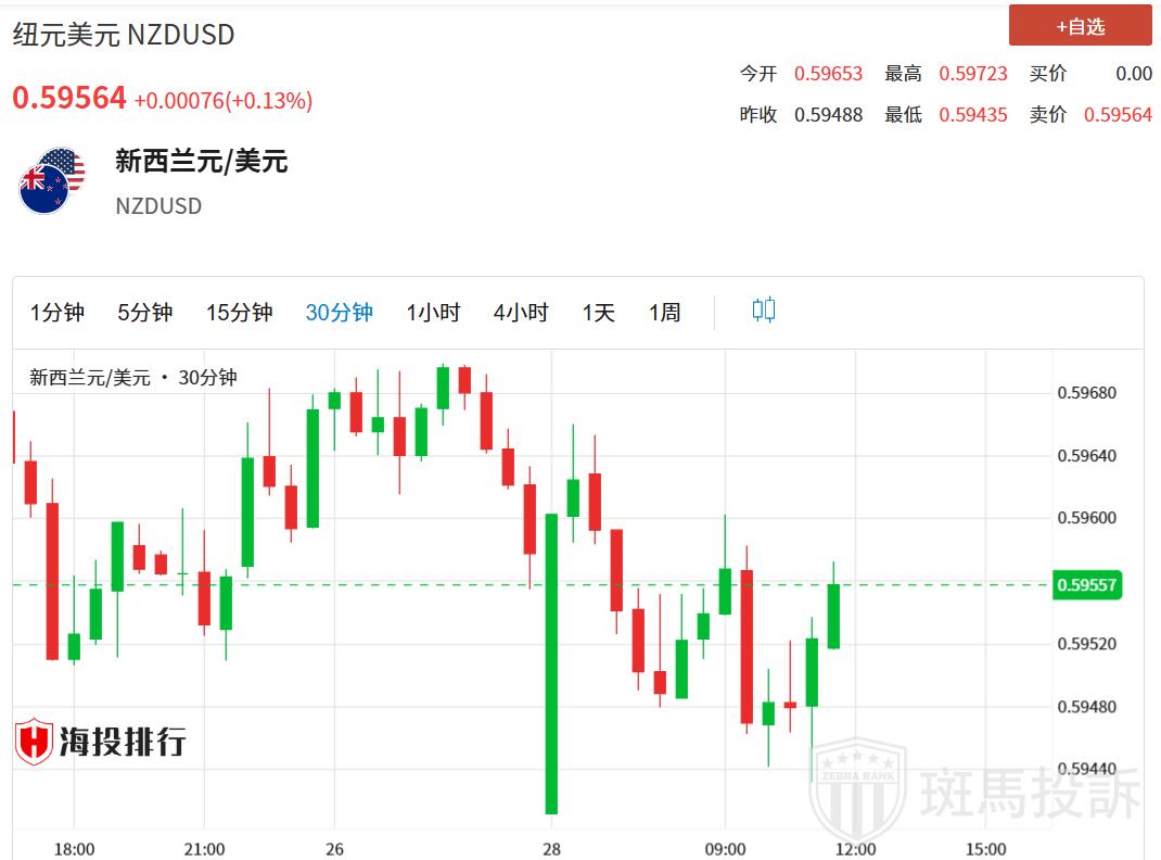 纽元/美元在周一亚洲时段小幅下滑至接近0.5950.