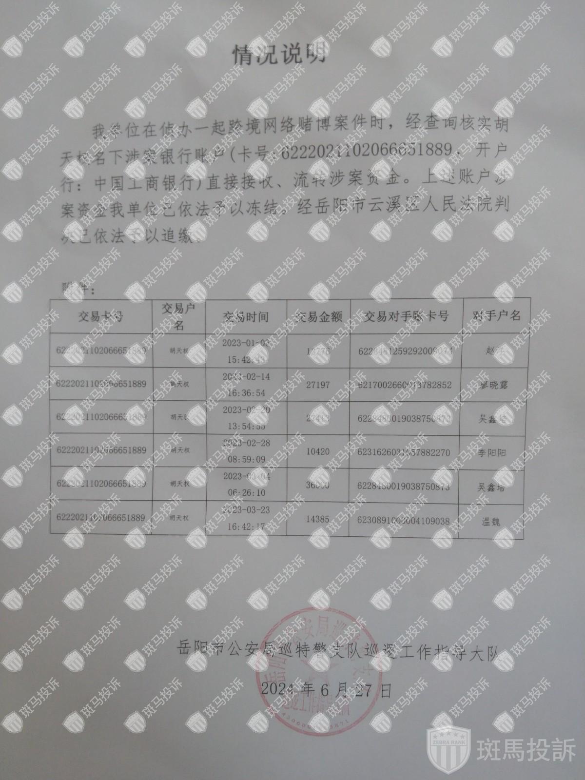 投资者A于2023年成功提现65,778元,但2023年底银行卡被湖南岳阳警方冻结,2024年6月资金被法院判决追缴。警方证实,该账户涉及“跨境网络赌博资金流转”,但平台以“时间过久”为由拒绝承担责任。