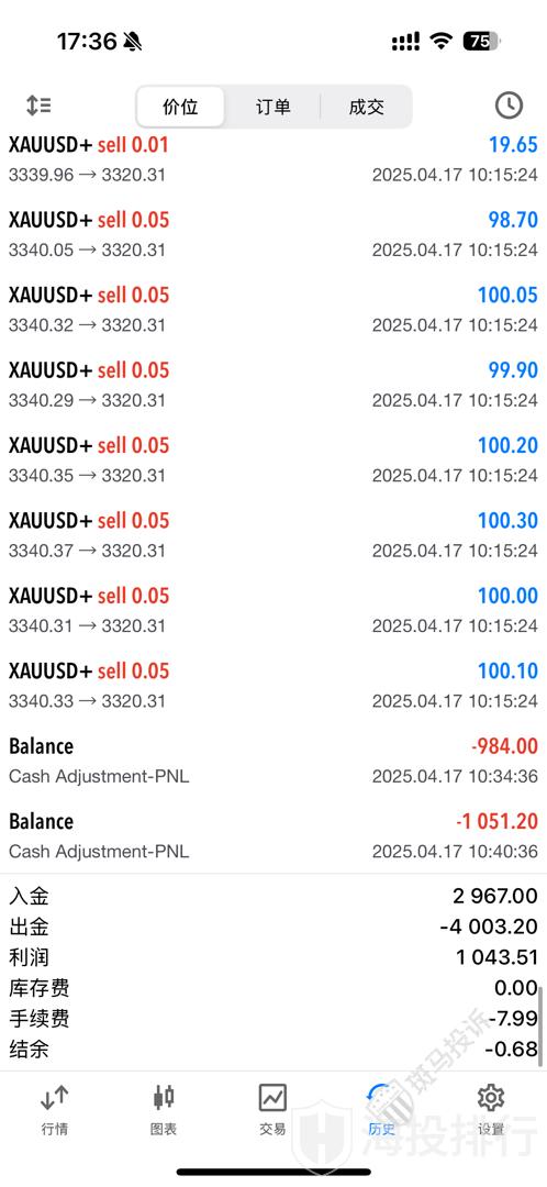 据该投资者描述,其在4月17日的白天轻仓做空黄金,黄金下跌了20美金,盈利1051.2美元。
