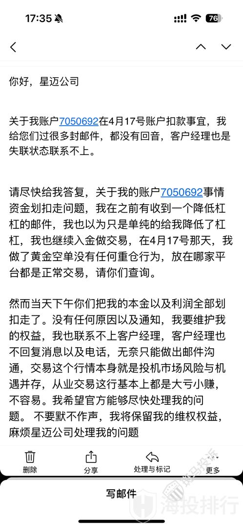 截至4月28日,投资者就账户情况与平台、平台客户经理、平台客服、平台邮箱进行了多次沟通,但没有收到满意的合理的解释。该投资者提供了他发给星迈的邮件: