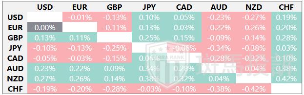 下表显示了美元(USD)对所列主要货币今日的变动百分比。[货币名称]对[货币名称]最强。