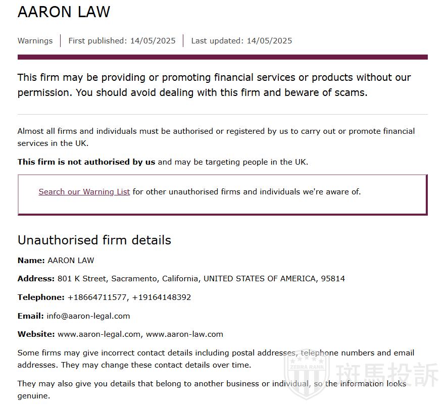 2025年5月14日FCA发布警告称,AARON LAW 可能在未经我们许可的情况下提供或推广金融服务或产品。您应避免与该公司交易,并谨防诈骗。