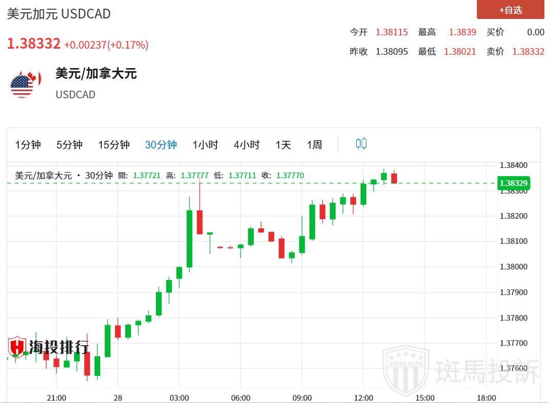 美元/加元货币对在周三延续了本周从1.3685区域(即2024年10月以来的最低水平)反弹的良好走势,已连续第三天上涨。目前现货价格交易于周高点附近,约在1.3835-1.3840区域,日内上涨近0.30%,受到了美元(USD)买盘的进一步推动。