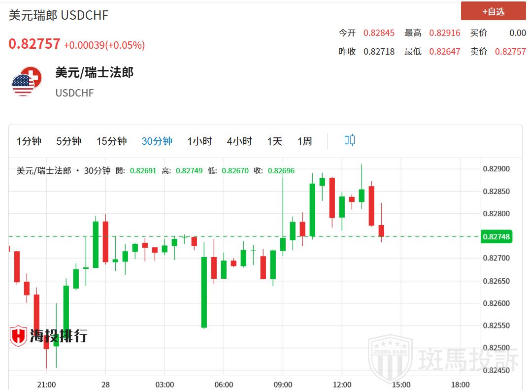 美元/瑞郎在周三欧市早盘上涨至接近0.8285。好于预期的美国消费者信心数据和改善的风险情绪为美元(USD)提供了一些支撑。交易者准备迎接瑞士ZEW调查和联邦公开市场委员会(FOMC)会议纪要,这些将在周三晚些时候发布。