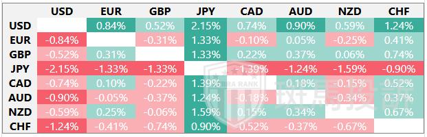 下表显示了美元(USD)对所列主要货币本周的变动百分比。[货币名称]对[货币名称]最强。