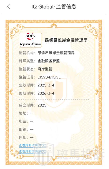 IQ Global平台官网称在科摩罗注册,持有国际经纪清算所许可证,许可证号为L15984/QGL。经查询,确实持有该牌照,但昂儒昂離岸金融管理局AOFA并不能监管外汇交易,并且该牌照将于明年3月份到期,这对投资者来说还是有一定潜在风险的,希望投资者能引起警惕。