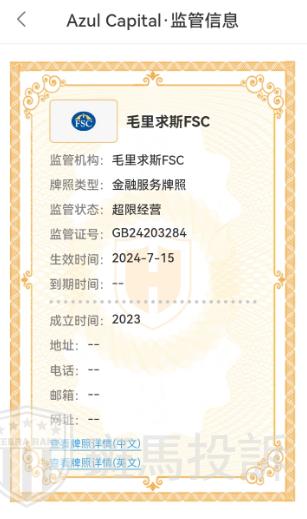 Azul Capital平台官网称在毛里求斯(FSC)注册,持有投资交易商许可证,许可证号为:GB24203284,经查询,确实持有该牌照,但毛里求斯(FSC)并不能监管外汇交易,这对投资者来说还是有一定潜在风险的,希望投资者能引起警惕。