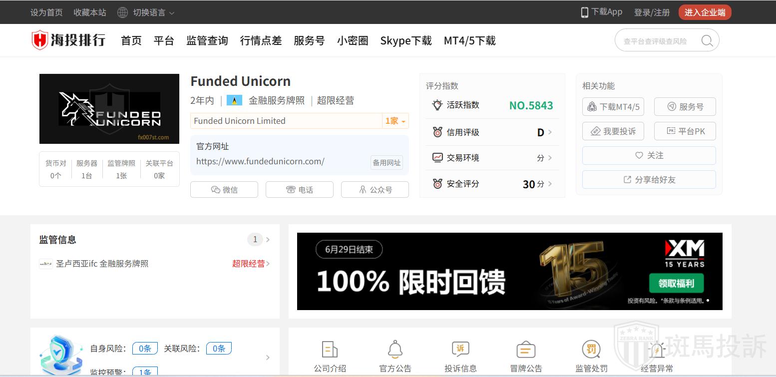 Funded Unicorn平台目前在斑马投诉未收到相关投诉。