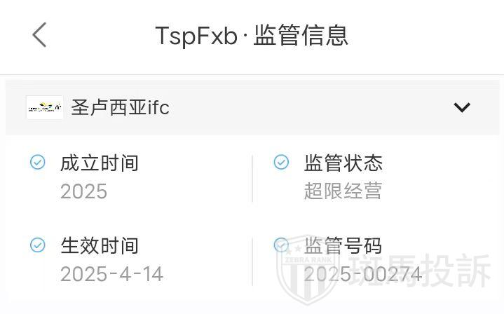 TspFxb受圣卢西亚授权并监管,注册号为2025-00274,并且圣卢西亚ifc本就不能监管外汇,具有一定的风险,望投资者谨慎。