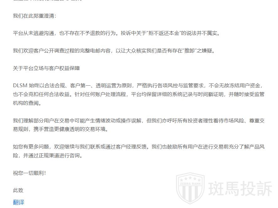 近期,有用户通过斑马投诉平台反映其在DLSM平台的交易经历,平台对此作出了回应,随着小编一起来看看什么情况!