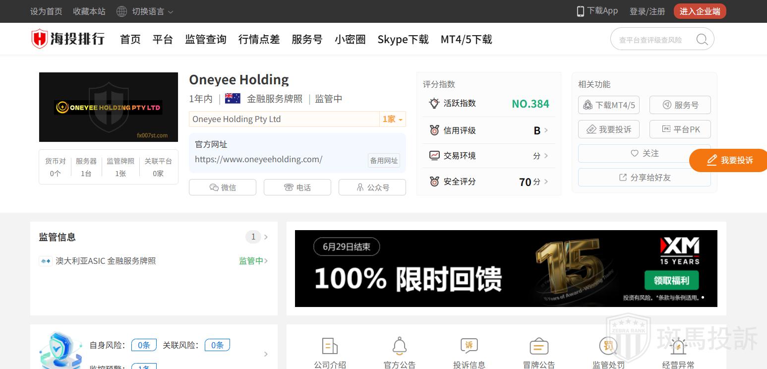 Oneyee Holding平台目前在斑马投诉未收到相关投诉。