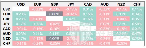 下表显示了纽元(NZD)对所列主要货币今日的变动百分比。[货币名称]对[货币名称]最强。