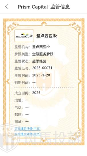 Prism Capital平台官网称在圣卢西亚ifc注册,持有交易商许可证,编号为:2025-00071,经查询,确实持有该牌照,但圣卢西亚ifc无权限监管外汇交易,这对投资者来说还是有一定潜在风险的,希望投资者能引起警惕。