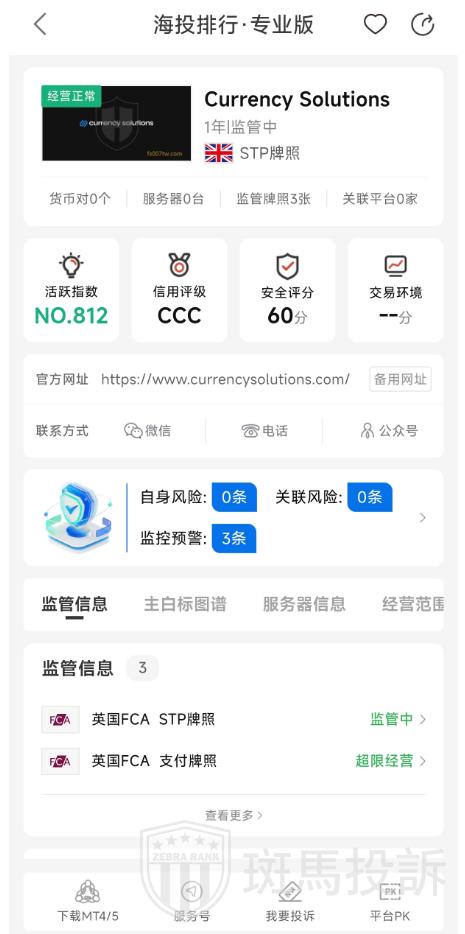这家平台叫Currency Solutions,成立于2025年,全球活跃指数812名,目前有3个监管,有1张外汇牌照,能做外汇保证金交易,风险扫描显示3条风险,投资者资金安全无保障。