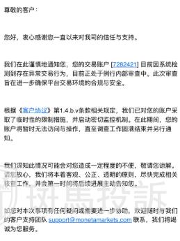 #据用户A某的具体经历,经过核实后保持原文:A某称,我的帐户7282421于6月19日,6830美金冻结,无法登陆、无法出金,且交易历史被清空。
