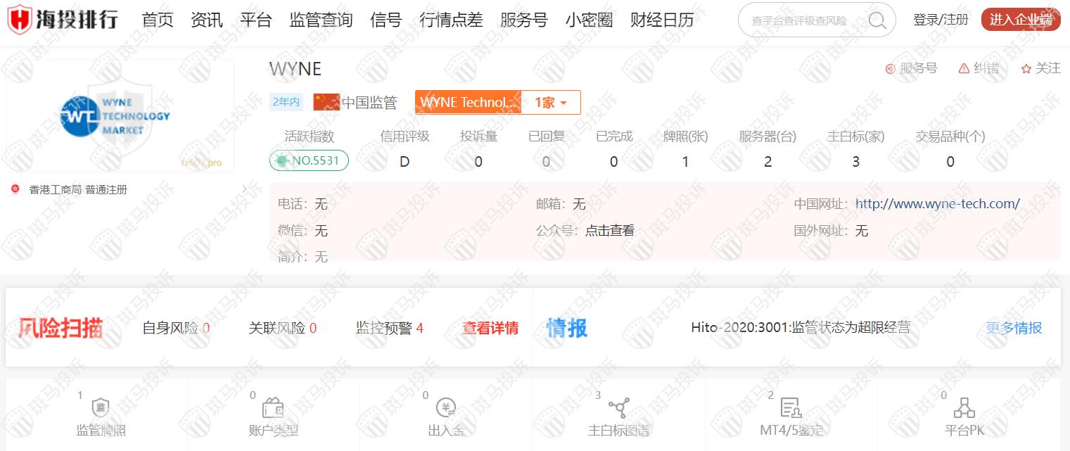 这家平台叫WYNE,成立于2020年,全球排名5531名,由香港工商局监管,但属于超限经营,没有外汇牌照,不能做外汇保证金交易,风险扫描显示4条风险,投资者资金安全无保障。