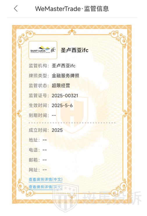 WeMasterTrade平台在圣卢西亚IFC注册,取得注册号为:2025-00321的金融服务牌照,但该监管机构没有监管外汇交易的职能,这会让投资者的资金处在风险中,望警惕!