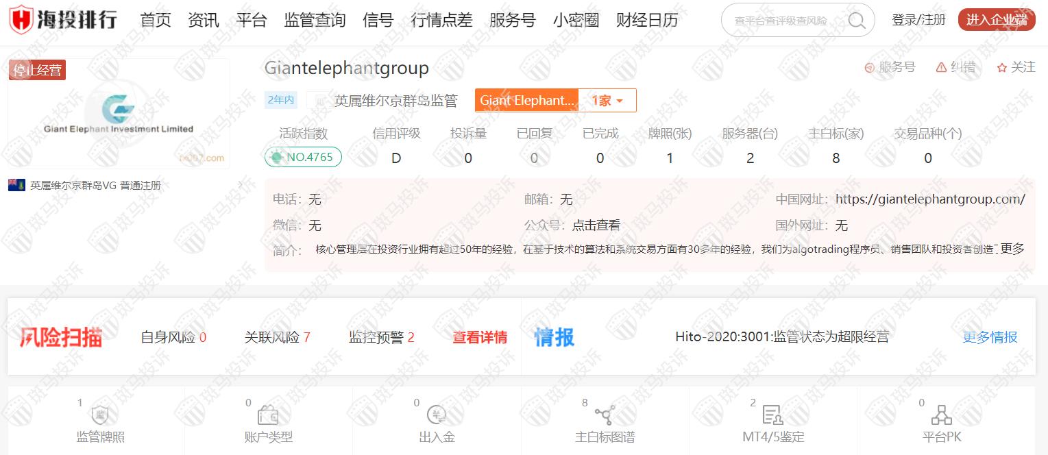 这家平台叫Giantelephantgroup,成立于2020年,全球排名4765名,目前停止经营,由英属维尔京群岛VG监管,但属于超限经营,没有外汇牌照,不能做外汇保证金交易,风险扫描显示2条风险,投资者资金安全无保障。