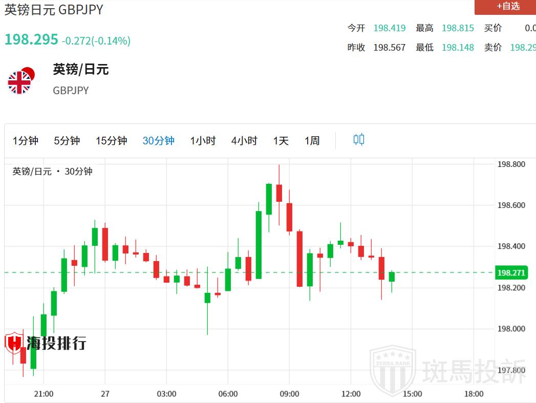 周五欧洲早盘时段,英镑/日元交叉盘上涨至约198.40。由于风险情绪改善,日元(JPY)兑英镑(GBP)走弱。