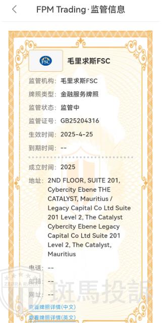 FPM Trading平台官网称在毛里求斯金融服务委员会 (FSC) 注册,持有交易商许可证,编号为:GB25204316,经查询,确实持有该牌照,但毛里求斯金融服务委员会 (FSC)无权限监管外汇交易,这对投资者来说还是有一定潜在风险的,希望投资者能引起警惕。