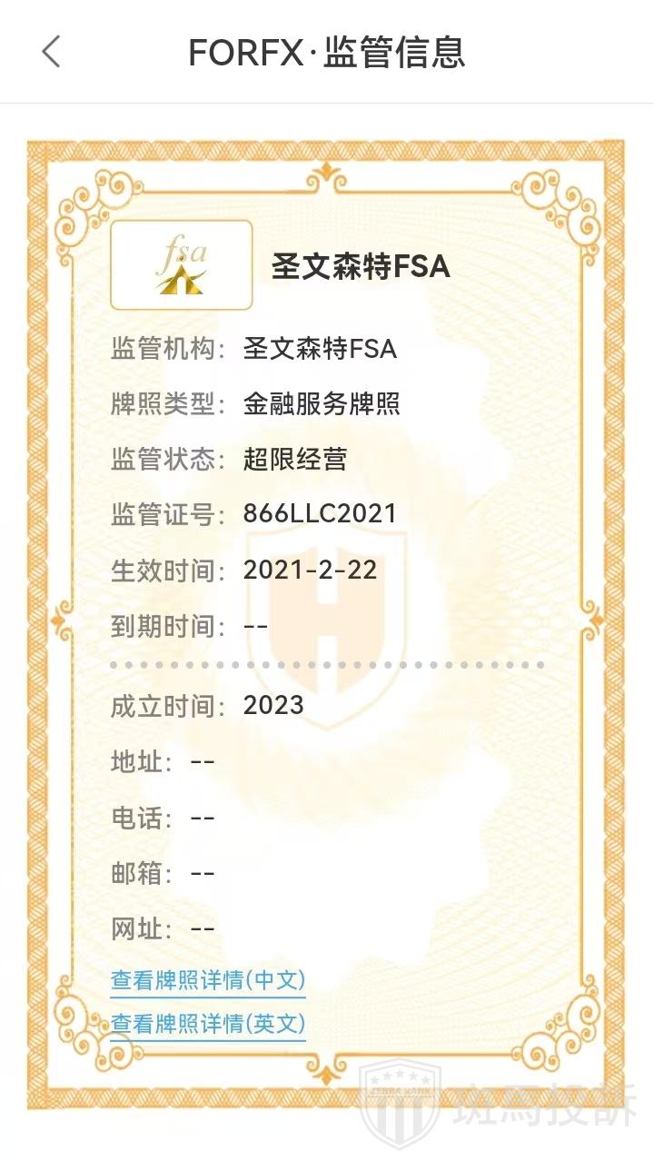 FORFX平台官网称在圣文森特和格林纳丁斯注册,持有交易商许可证,编号为:866LLC2021,经查询,该公司确实持有该牌照,但圣文森特FSA没有监管外汇交易的权利,这对投资者来说还是有一定潜在风险的,希望投资者能引起警惕。